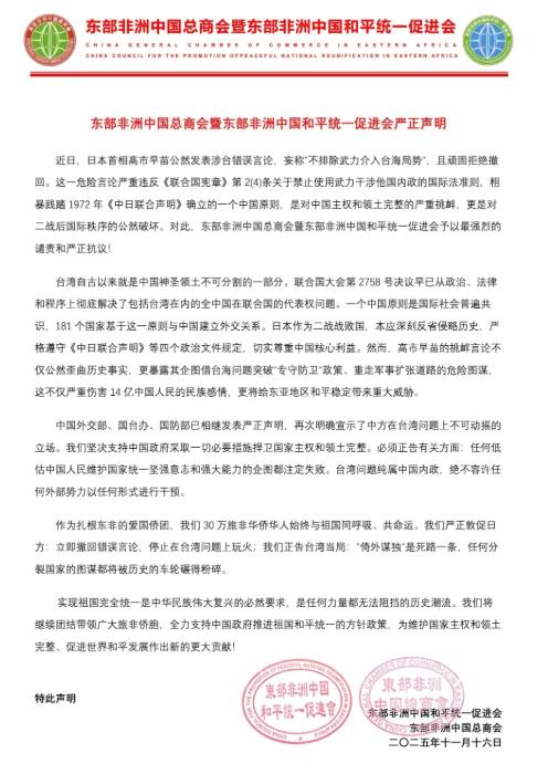 • 东部非洲中国总商会暨东部非洲中国和平统一促进会严正声明 2025-11-17